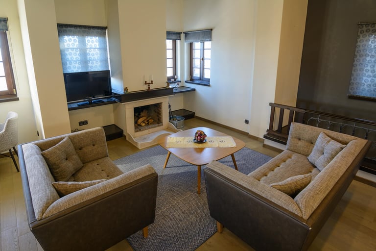 Στον ένα όροφο διαθέτει ένα ενιαίο μεγάλο υπνοδωμάτιο, με ένα μεγάλο διπλό κρεβάτι 1,80μ φάρδος και δυο μονά. Στον όροφο αυτό υπάρχει μεγάλο dressing room και μπάνιο με μεγάλη μπανιέρα. Στον άλλο όροφο διαθέτει καθιστικό με σαλόνι μπροστά στο τζάκι, τραπεζαρία και πλήρως εξοπλισμένη κουζίνα. Η κατοικία διαθέτει ενδοδαπέδια θέρμανση, τηλεοράσεις σε όλους τους χώρους και είναι επιπλωμένη με ιδιαίτερο γούστο και ποιότητα.